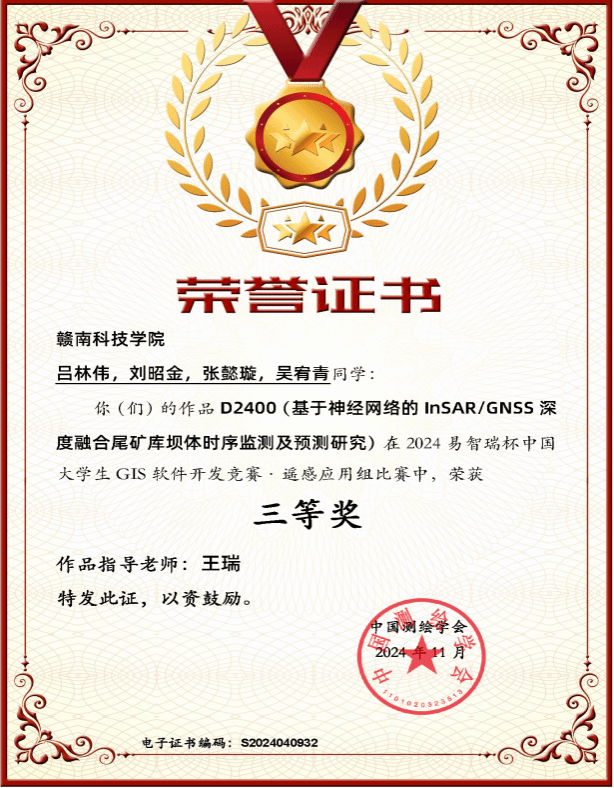 本网讯:近日,2024年易智瑞杯中国老员工GIS软件开发竞赛揭晓比赛结果。由公司王瑞老师指导,员工吕林伟、刘昭金、张懿璇、吴宥青团队提交的《基于神经网络的InSAR/GNSS深度融合尾矿库坝体时序监测及预测研究》作品,在2024易智瑞杯中国老员工GIS软件开发竞赛·遥感应用组380个参赛作品中,荣获本次比赛三等奖。