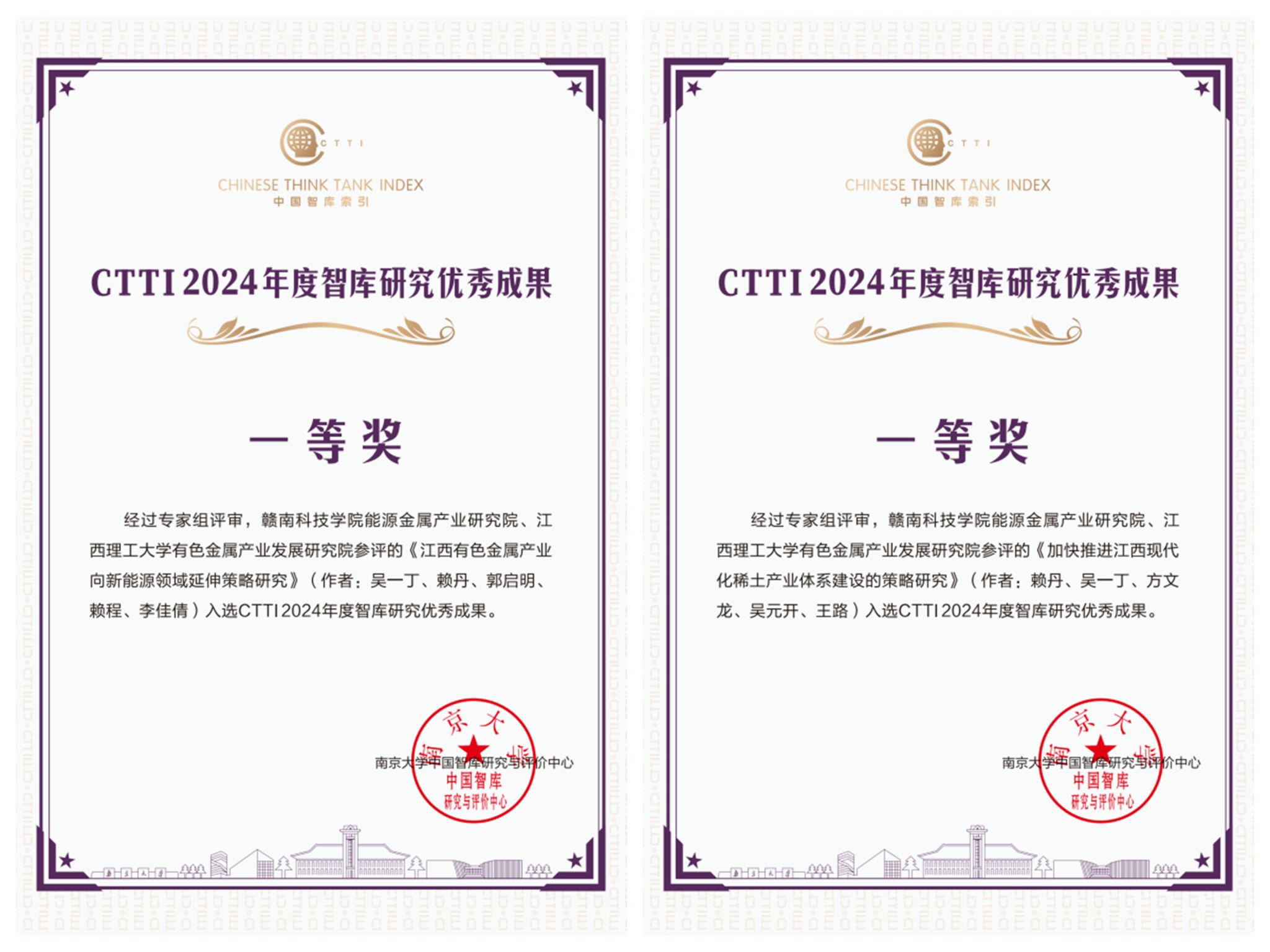 本网讯:近日,“2024年度新型智库治理论坛”在兰州举行。来自全国各省市智库管理部门、智库机构负责人和专家学者共600余人参加了此次论坛。本次论坛发布了“中国智库索引”(CTTI) 2024年度智库建设最佳案例和智库研究优秀成果。以公司能源金属产业研究院为主参评的两项智库研究成果均荣获CTTI智库优秀成果一等奖,公司是江西省唯一同时获得2项优秀成果一等奖的单位。