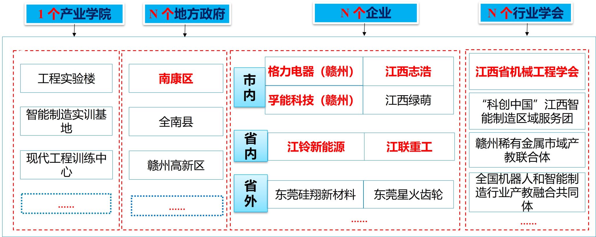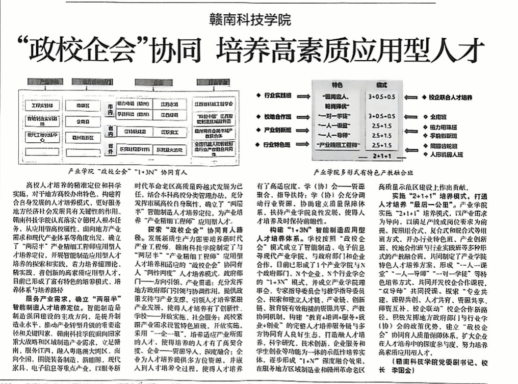 构建“1+3N”智能制造应用型人才培养体系。集团按照“政校企会”模式成立了智能制造、电子信息等现代产业公司,与政府部门和企业合作,目前已形成了1个产业公司与N个政府部门、N个企业、N个行业学会的“1+3N”模式,并成立产业公司理事会、专家指导委员会与教学指导委员会,探索和建立人才链、产业链、创新链、教育链有效衔接的资源共享、产教协同机制,构建“教育+培训+服务+就业+创业”的完整人才培养服务链与多方协同育人良好生态,打造融人才培养、科学研究、技术创新、企业服务和员工创业等功能为一体的示范性培养实体,逐步形成“1+N3”深度融合效果,在服务地方区域制造业和赣州革命老区高质量示范区建设上作出贡献。