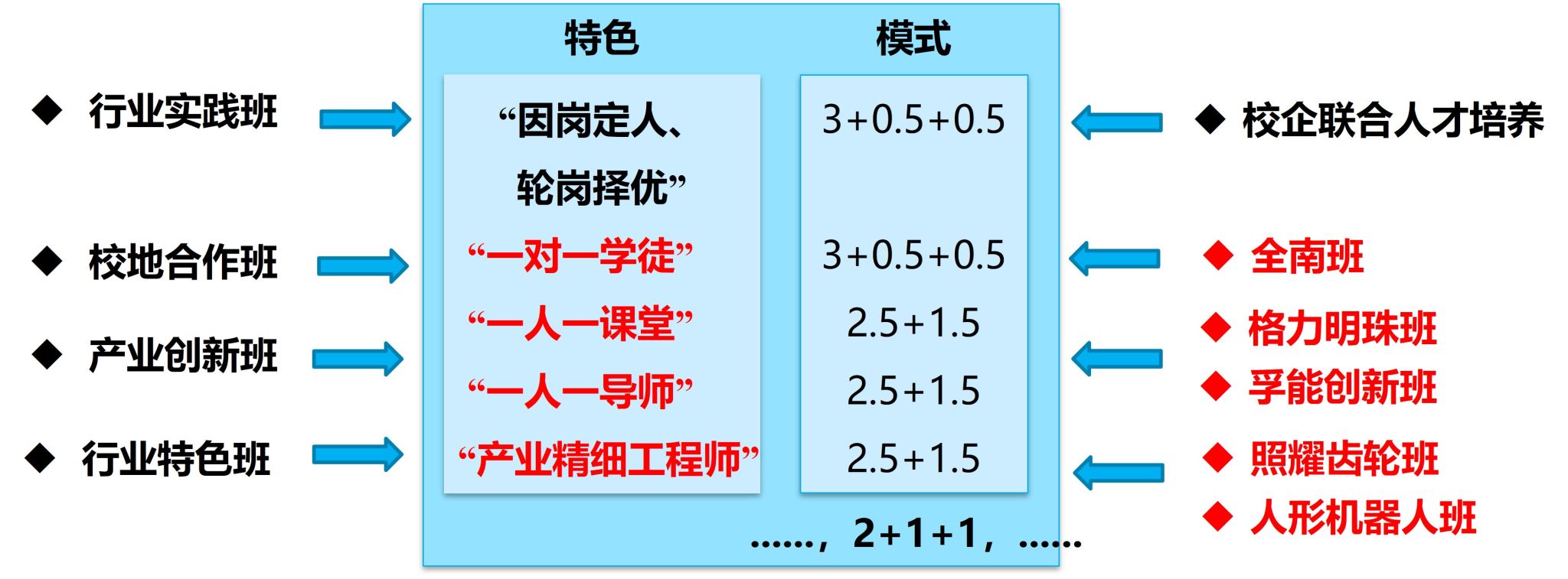实施“2+1+1”培养模式,打通人才培养“最后一公里”。产业公司实施“2+1+1”培养模式,以产业需求为导向,以满足产线或岗位要求为前提,按照组合式、复合式和混合式等组班方式,开办行业特色班、产业创新班、校地合作班与行业实践班等多种形式的产教融合班,共同制定了产业公司特色人才培养方案,形成“一人一课堂”“一人一导师”“一对一学徒”等特色培养方式,共同开发校企合作课程,“双导师”共同授课。探索“专业共建、课程共创、人才共育、资源共享、团队互补、校企联动”校企合作新路径,积极发挥地方政府部门与行业学(协)会的政策优势,建立“政校企会”协同育人质量保障体系,扩大企业在人才培养中的深度参与度,努力培养高素质应用型人才。