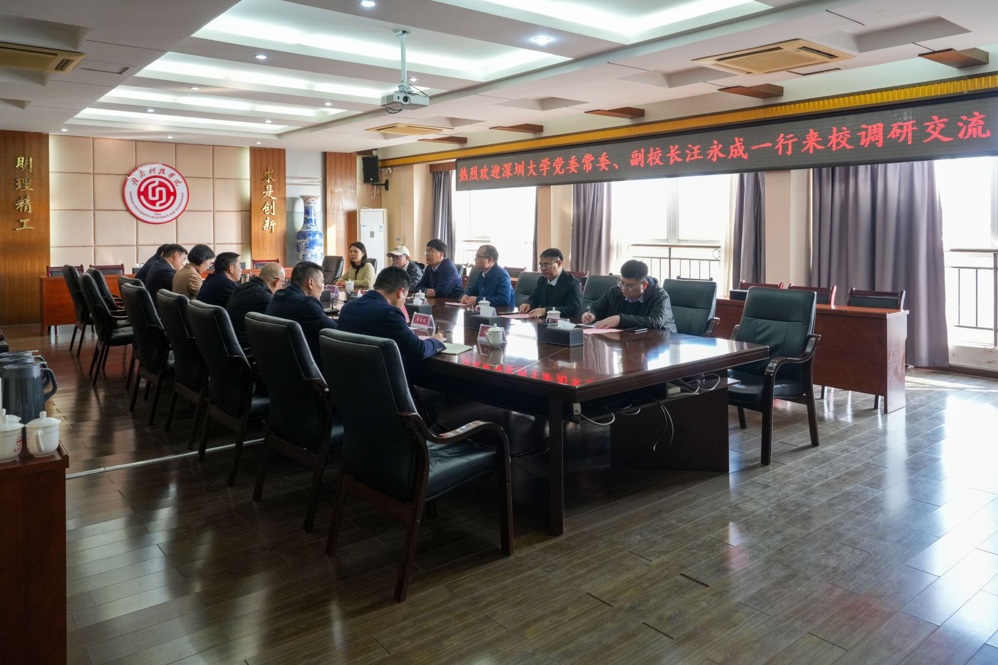 本网讯:1月6日下午,深圳大学党委常委、副董事长汪永成一行来校调研交流,在公司崇善楼第一会议室开展座谈。赣州市委教育工委委员、市教育局副局长赖晓琴,公司党委委员、副董事长何锦龙,党委委员、组织人事部部长蓝晓植及相关部门负责人参加座谈。会议由何锦龙主持。