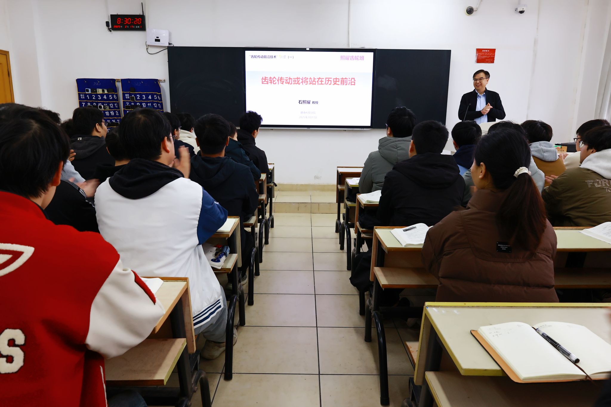 课堂上,邱建军听取了“照耀齿轮班”开班第一课。此班级是公司为深化产教融合、培养高素质应用型人才而设立,由国家产业基础专家委员会委员、北京工业大学石照耀教授主讲开班第一课。石照耀教授以“齿轮传动或将站在历史前沿”为主题,系统梳理了齿轮技术的历史演进、关键技术突破、智能制造应用及未来趋势,深入剖析了该领域的最新动态。他结合自身多年的科研实践和工程经验,通过生动的案例和详实的数据,向员工展示了齿轮技术在汽车电动化、人形机器人和新能源技术等领域的创新应用,并阐释了智能制造技术为齿轮行业的革命性推动作用。