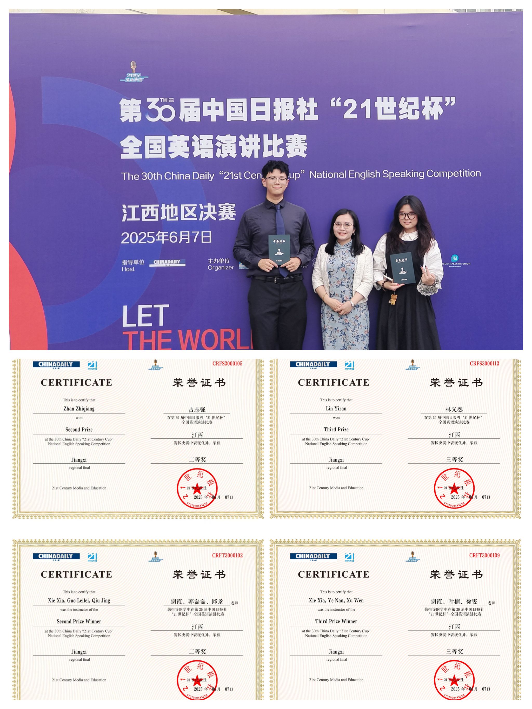 本网讯:6月7日,第30届中国日报社“21世纪杯”全国英语演讲比赛江西赛区复赛在南昌大学举行,公司英语231班占志强,法学232班林义然分别获得江西赛区二等奖、三等奖。